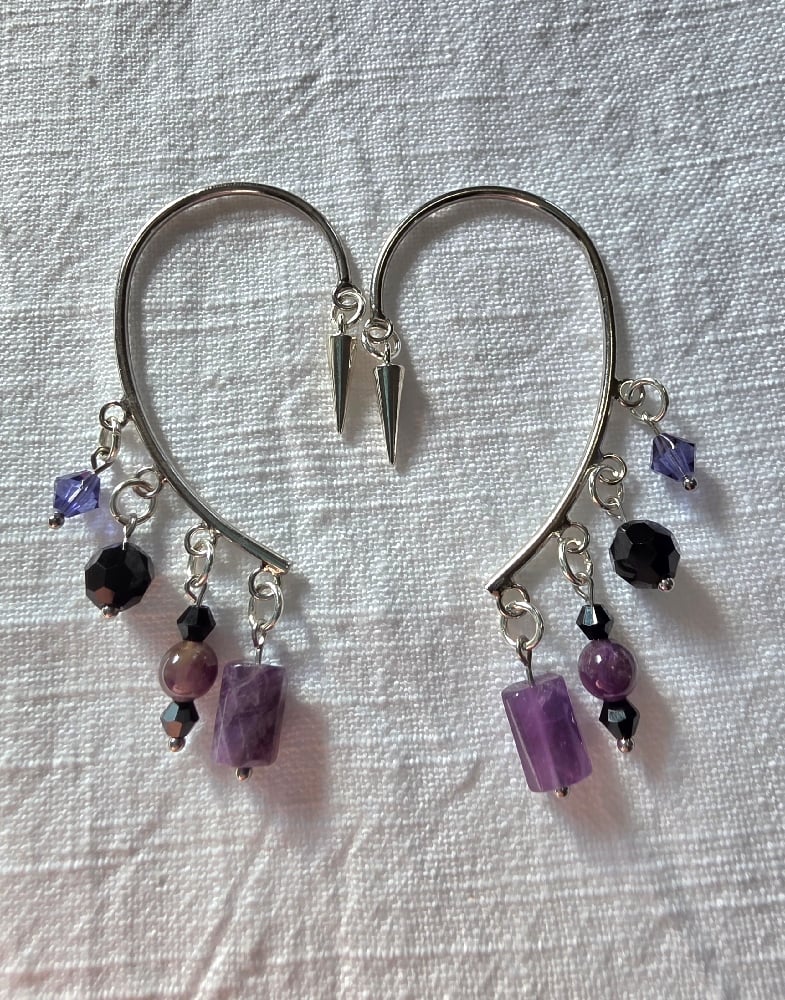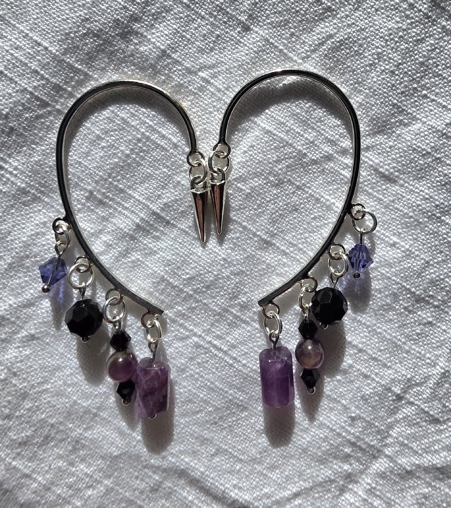 Adorned with amethyst, percosia crystal, and glass. 100% hypoallergenic stainless steel material. These do not require a piercing.