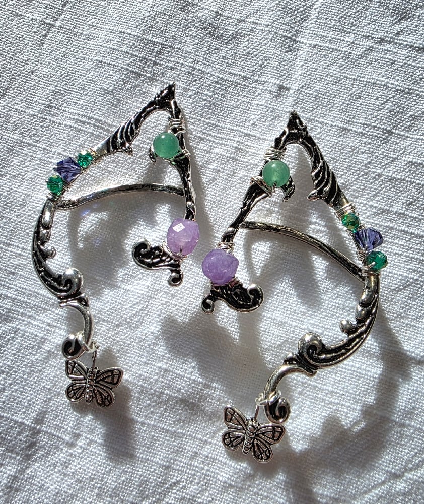 Get in touch with your inner fae/elf with this set of ear cuffs🧝♀️🩵🦋🪻💧🌌 Adorned with aquamarine, amethyst, and Percosia crystals.