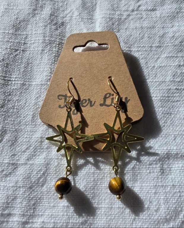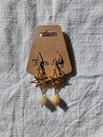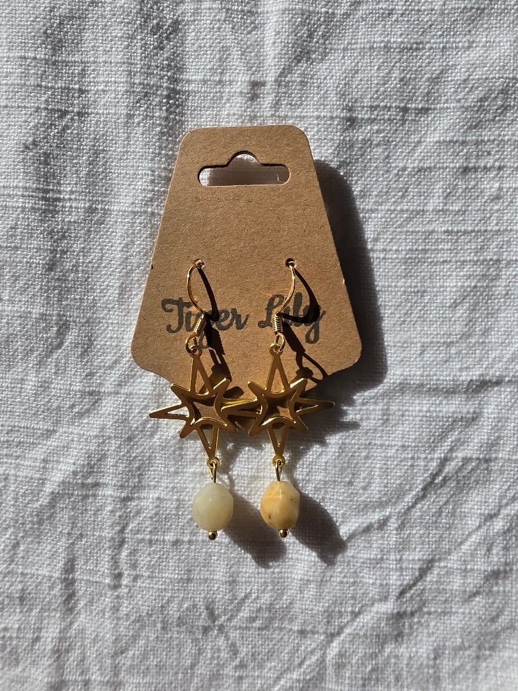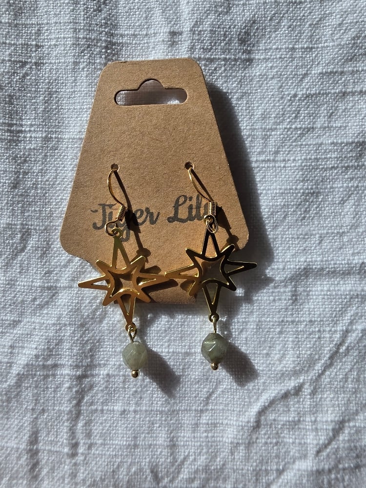 Handmade hypoallergenic dangly earrings. These are light weight. Earrings hooks are 18k gold stamped. Other materials include gold plated stainless steel, and gold plated brass wire used to connect beading. 100% genuine crystals, stones, or glass beads.