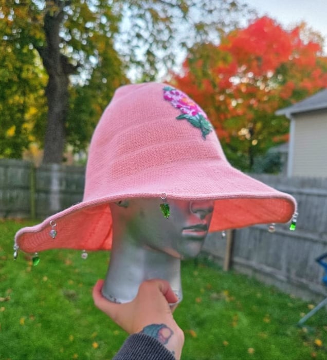 Handmade from canvas material, very durable, with a wire through the brim so it's completely adjustable! The patch is hand-sewn, and the brim is beaded with different jewels and gems 💎 Every witch needs their own custom magical hat!! 🧙♀️🔮🪄